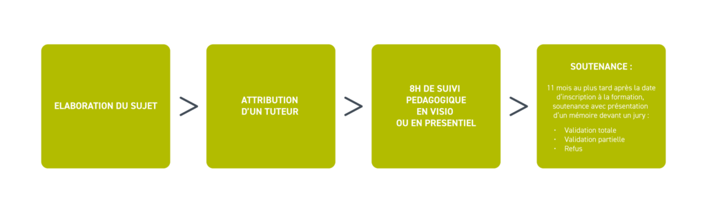 L’accompagnement se réalise sous la forme d’un tutorat individualisé, en face à face avec l’enseignant tuteur. L’élaboration d’un dossier complet, comprenant des éléments illustrant son parcours, se déroule sur une période de 6 à 8 mois durant laquelle le candidat bénéficiera de 8 heures de face à face et d’échanges à distance retranscrits à chaque rencontre dans un compte rendu. L’accompagnement comprend également une lecture du dossier et une préparation à l’entretien avec le jury. L’accompagnement démarre obligatoirement le mois qui suit l’inscription.