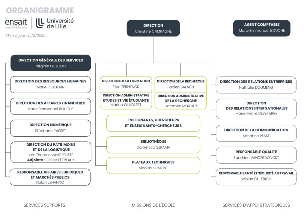 L’École Nationale Supérieure des Arts et Industries Textiles est un EPSCP (Établissement Public à Caractère Scientifique, Culturel et Professionnel).
