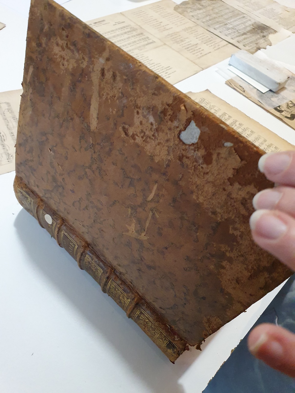 Encadrés par la professionnelle, les participants ont pu travailler sur la restauration des couvertures : nettoyage, consolidation et réparation des cuirs abîmés par le temps.